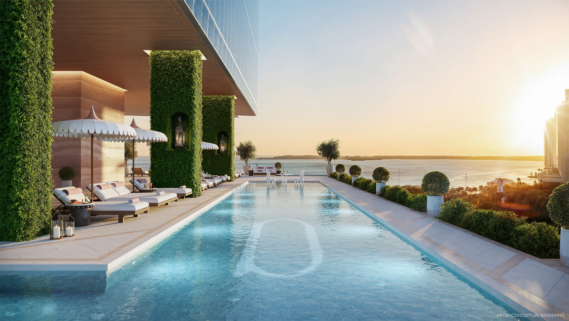 - Resort-style pool deck with wrap-around pool, cabanas and lounge areas, and bar overlooking Biscayne Bay